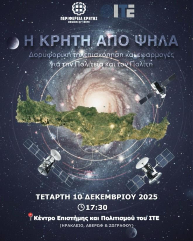 «Η Κρήτη από ψηλά: Δορυφορική τηλεπισκόπηση και εφαρμογές για την Πολιτεία και τον Πολίτη» είναι το θέμα της επιστημονικής – ενημερωτικής εκδήλωσης που διοργανώνουν σήμερα Τετάρτη 10 Δεκεμβρίου 2025 η Περιφέρεια Κρήτης και το Ίδρυμα Τεχνολογίας και Έρευνας