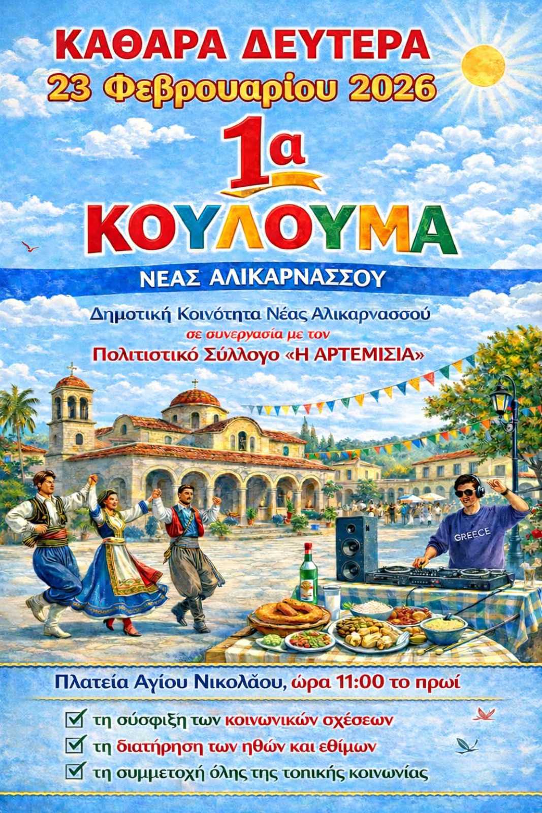«Η Δημοτική Κοινότητα Νέας Αλικαρνασσού, σε συνεργασία με τον Πολιτιστικό Σύλλογο Νέας Αλικαρνασσού «Αρτεμισία», σας προσκαλούν στον εορτασμό της Καθαράς Δευτέρας («Κούλουμα»), τη Δευτέρα 23 Φεβρουαρίου 2026 και ώρα 11:00 π.μ., στην Πλατεία Αγίου Νικολάου Νέας Αλικαρνασσού.