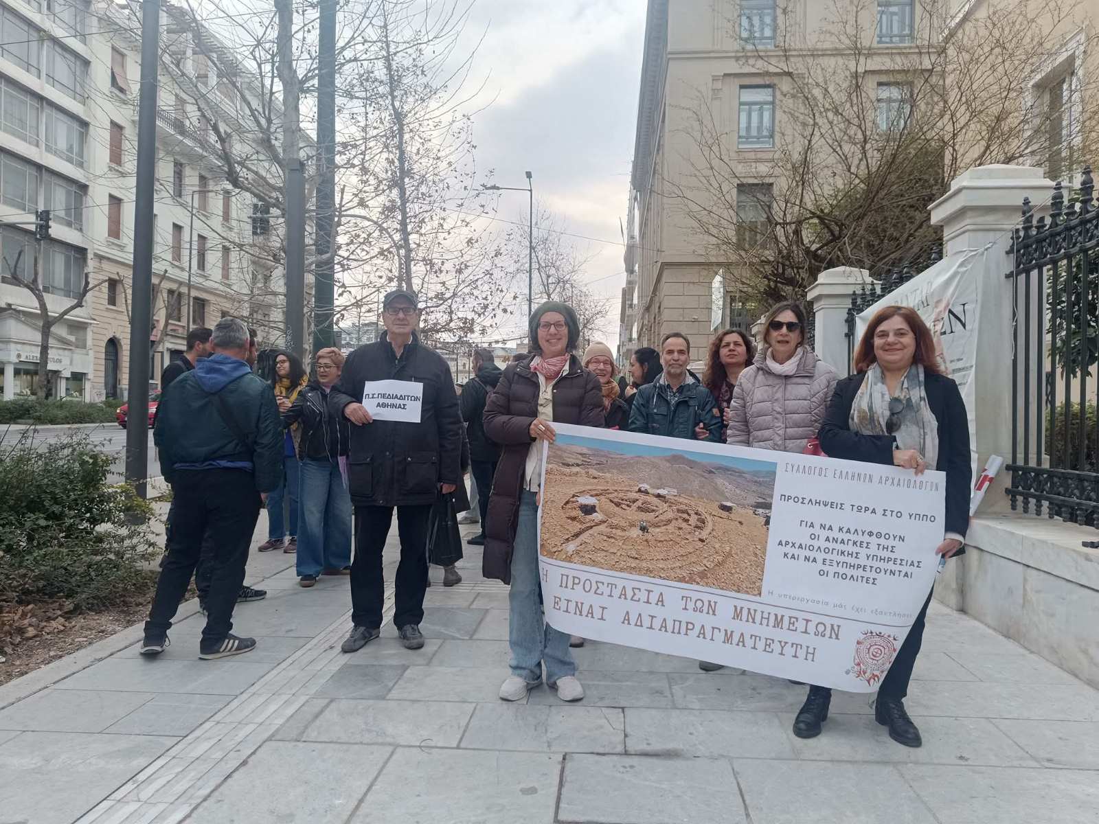 Από νωρίς το πρωί έξω από το ανώτατο ακυρωτικό δικαστήριο της χώρας είχαμε «απόβαση» αρχαιολόγων που εξέφρασαν δυναμικά τη στήριξη τους στην προσφυγή. Άλλωστε οι Σύλλογοι Ελλήνων Αρχαιολόγων και Εκτάκτων Αρχαιολόγων είχαν προκηρύξει για σήμερα πανελλαδική στάση εργασίας και συγκέντρωση έξω από το ΣτΕ.