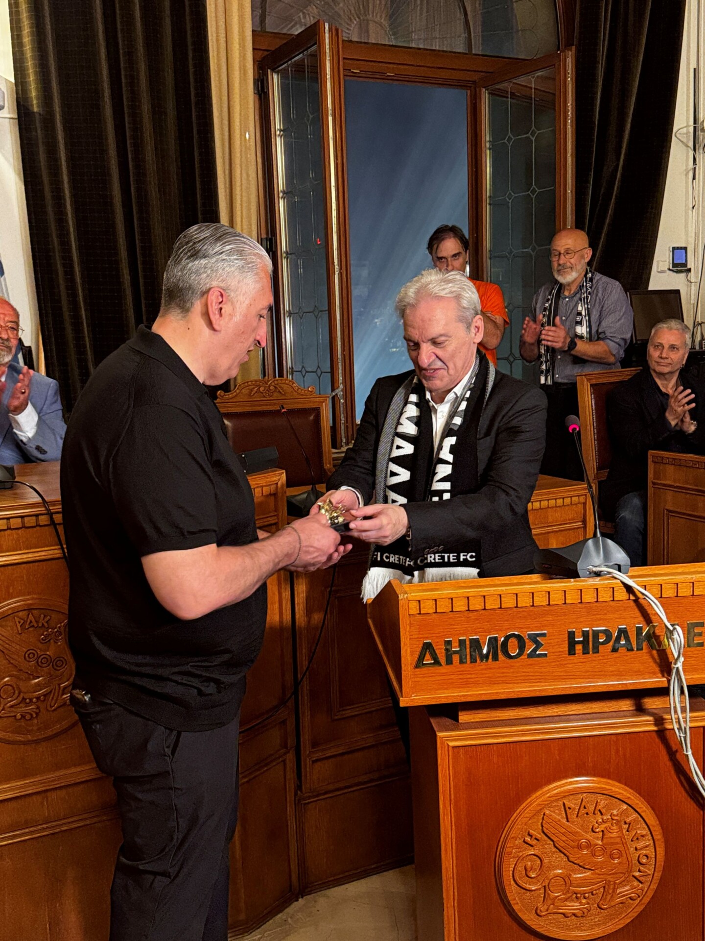 Αυτή η ομάδα που έχει βγει από τα σπλάχνα της πόλης, που είναι κομμάτι της ψυχής, που είναι μέρος της ταυτότητας και του Ηρακλείου αλλά και του νησιού ολόκληρου, που ξεκίνησε από τις αλάνες και τα καφενεία του μεσοπολέμου, από εργάτες, φοιτητές, υπαλλήλους, εργαζόμενους, από πρόσφυγες. Διέγραψε μια πορεία με προσαρμογές η οποία οδηγεί και σήμερα σε μια στιγμή μεγάλης δόξας. Γιατί αυτό πραγματικά είναι δόξα. Σας ευχαριστώ για την επιμονή, την δέσμευση, την προσήλωση με την οποία υπηρετήσατε αυτόν τον στόχο από την στιγμή που αναλάβατε την ομάδα που έχει και ένα παρελθόν σημαντικών επιτυχιών.
