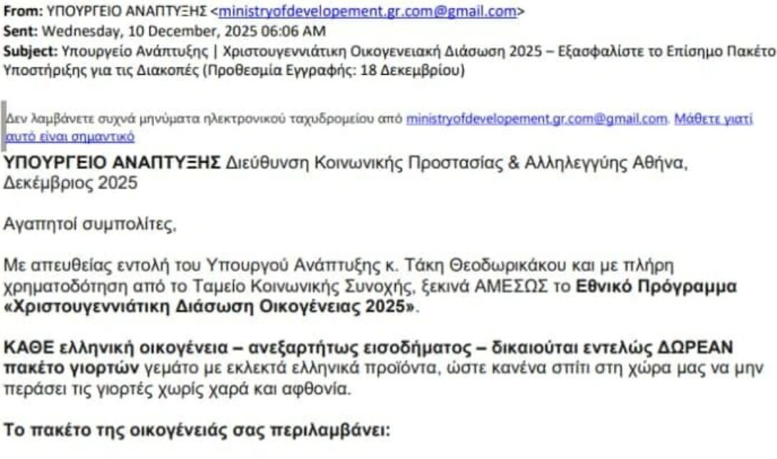 Μεγάλη προσοχή συνίσταται στους πολίτες και ιδίως στους ηλικιωμένους, καθώς τις τελευταίες ημέρες ακόμη ένα παραπλανητικό e-mail εντοπίστηκε να διακινείται, αυτή τη φορά έχοντας τη μορφή δήθεν κρατικού προγράμματος που υπόσχεται δωρεάν γιορτινό πακέτο από το Υπουργείο Ανάπτυξης με τον τίτλο «Χριστουγεννιάτικη Διάσωση Οικογένειας 2025».