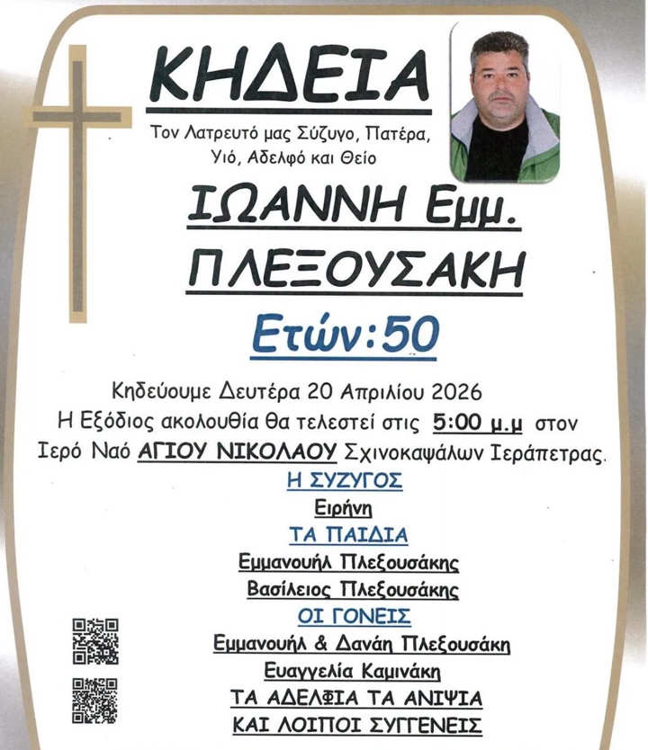 - Η τοπική κοινωνία της Ιεράπετρας πενθεί για τον θάνατο του Γιάννη Πλεξουσάκη, πατέρα δύο παιδιών.