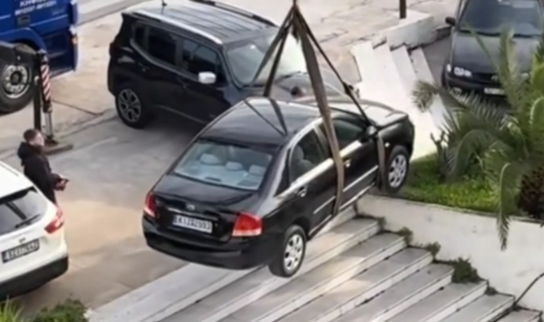 Μάλιστα, λόγω του πώς είναι διαμορφωμένος ο χώρος, η απομάκρυνση δεν μπορούσε να γίνει με συμβατικό τρόπο, με αποτέλεσμα ο γερανός να χρησιμοποιήσει ιμάντες για την ανύψωση του αυτοκινήτου.