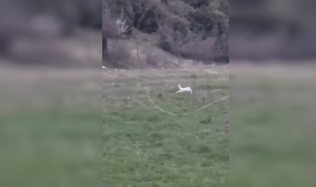 Στο βίντεο που δημοσιεύθηκε φαίνεται το ένα από τα δύο αλμπίνο ζαρκάδια να βόσκει ανέμελα στα χωράφια, κάνοντας μικρά άλματα στο έδαφος.