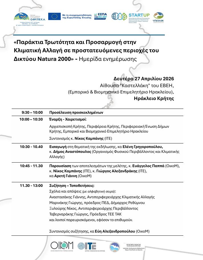 Στο πλαίσιο της , ολοκλήρωσης του έργου διοργανώνεται ενημερωτική ημερίδα για την παρουσίαση των αποτελεσμάτων του, η οποία θα πραγματοποιηθεί τη Δευτέρα 27 Απριλίου 2026 και ώρα 10:00 π.μ., στην αίθουσα «Καστελλάκη» του Εμπορικού & Βιομηχανικού Επιμελητηρίου Ηρακλείου (ΕΒΕΗ), στο Ηράκλειο.