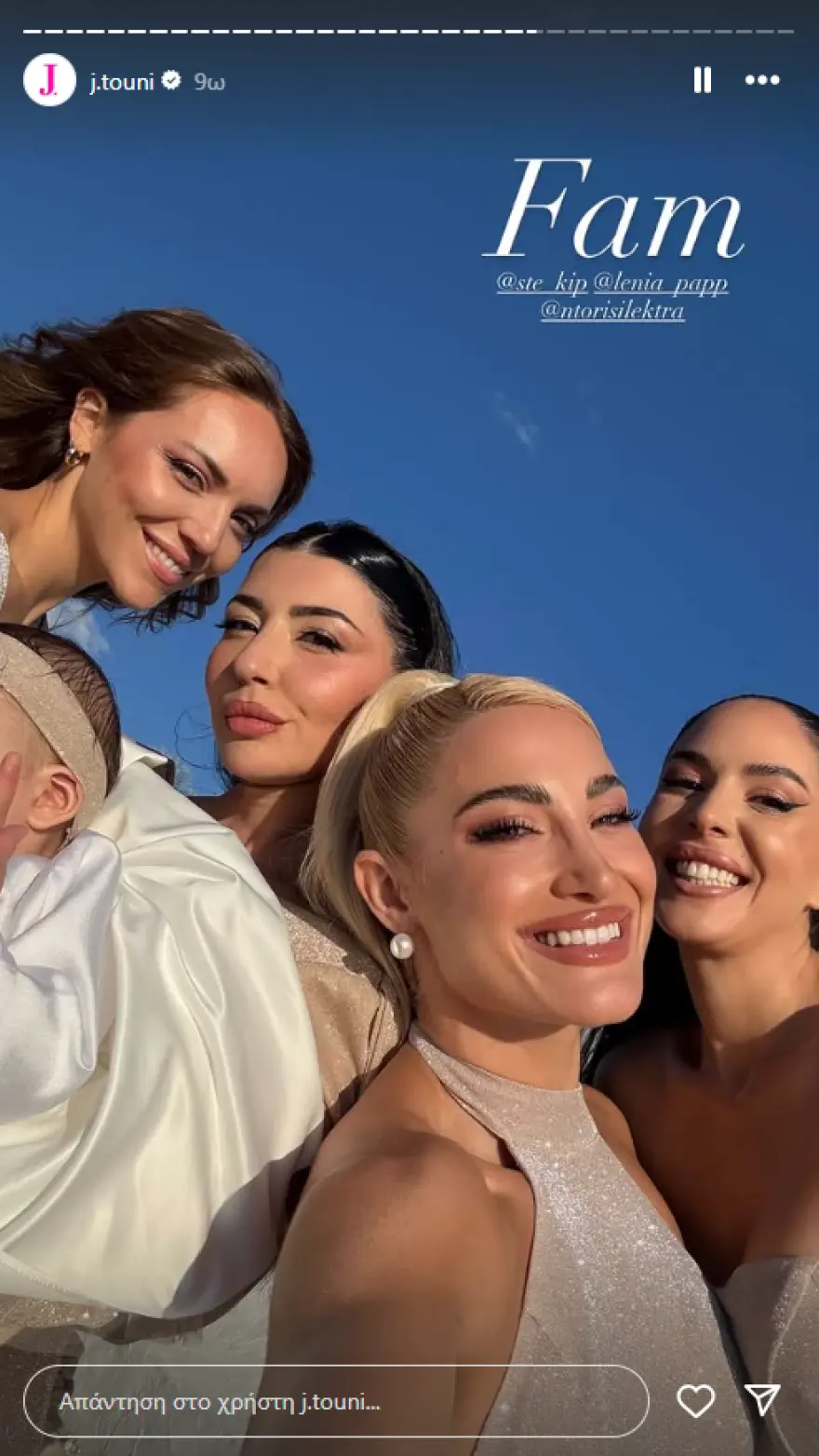 Στο υλικό που αναρτήθηκε, οι τρεις νονές εμφανίζονται ντυμένες με ασορτί μακριά μπεζ φορέματα, όπως και η μητέρα του παιδιού. Φυσικά, από το πλευρό της Ιωάννας Τούνη όπως φαίνεται και στις φωτογραφίες, δεν έλειπε ο γιος της, Πάρης.