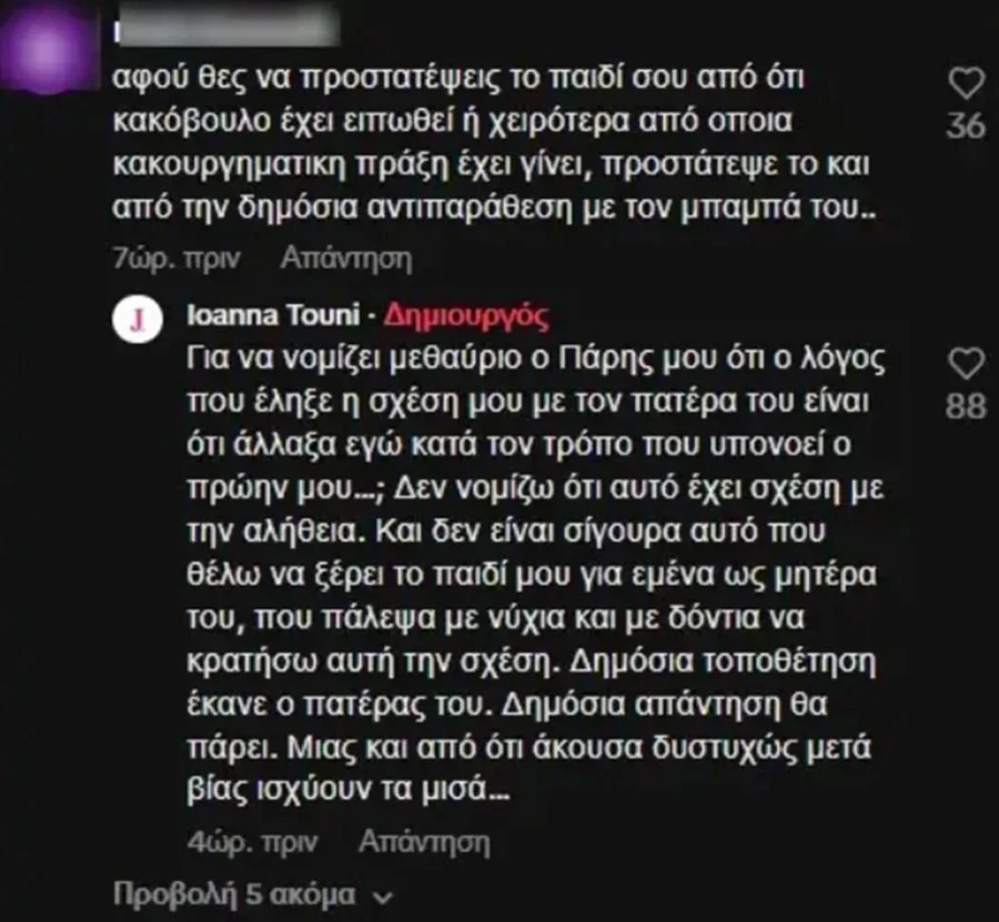 Δεν νομίζω ότι αυτό έχει σχέση με την αλήθεια. Και δεν είναι σίγουρα αυτό που θέλω να ξέρει το παιδί μου για εμένα ως μητέρα του, που πάλεψα με νύχια και με δόντια να κρατήσω αυτή την σχέση. Δημόσια τοποθέτηση έκανε ο πατέρας του. Δημόσια απάντηση θα πάρει. Μιας και από ότι άκουσα δυστυχώς μετά βίας ισχύουν τα μισά».