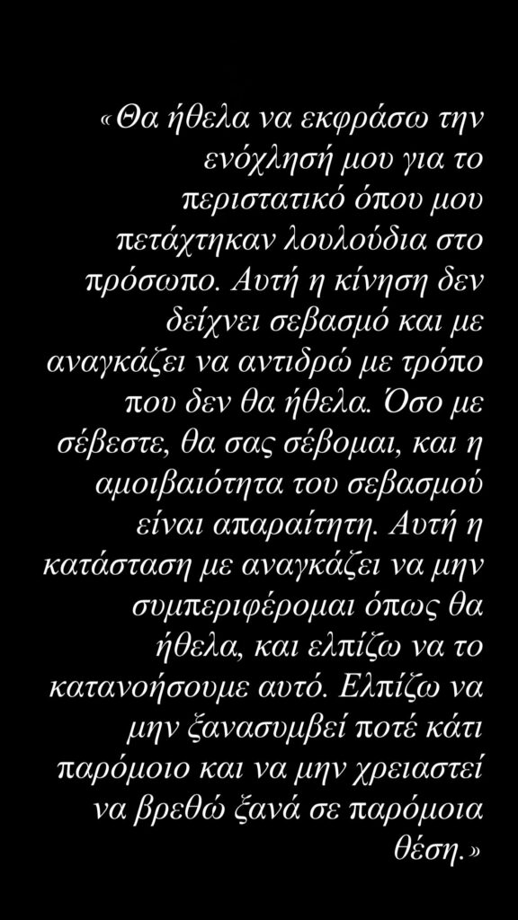 Λίγες ημέρες αργότερα, η ερμηνεύτρια επέλεξε να τοποθετηθεί δημόσια μέσα από τον προσωπικό της λογαριασμό στο Instagram, δίνοντας τη δική της οπτική για όσα συνέβησαν. Με ξεκάθαρο και αυστηρό τόνο, υπογράμμισε πως τέτοιες συμπεριφορές δεν έχουν καμία σχέση με τη διασκέδαση και δεν τιμούν ούτε τον χώρο ούτε τον καλλιτέχνη.