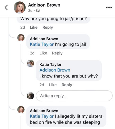 Σύμφωνα με τα δικαστικά έγγραφα, η αστυνομία του Λούισβιλ υποστηρίζει ότι η Addison Brown έστειλε γραπτά μηνύματα σε διάφορα άτομα «παραδεχόμενη ότι έβαλε σκόπιμα τη φωτιά σε μια προσπάθεια να σκοτώσει» την αδελφή της – μεταξύ των παραληπτών ήταν και η ίδια η Breah.