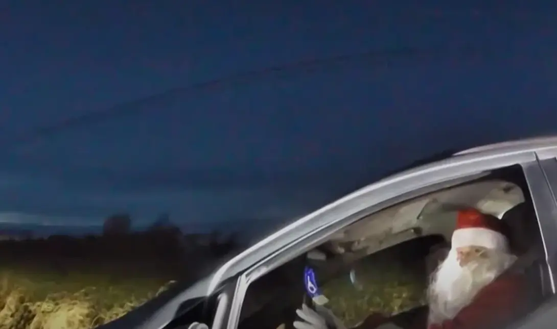 Στο βίντεο διακρίνεται ένα περιπολικό να σταματά το όχημά του και όταν πλησίασαν οι αστυνομικοί αντιλήφθηκαν ότι οδηγός ήταν ένας Άγιος Βασίλης και δίπλα του η κυρία Κλάους, αντιμετωπίζοντας το περιστατικό με χιούμορ.