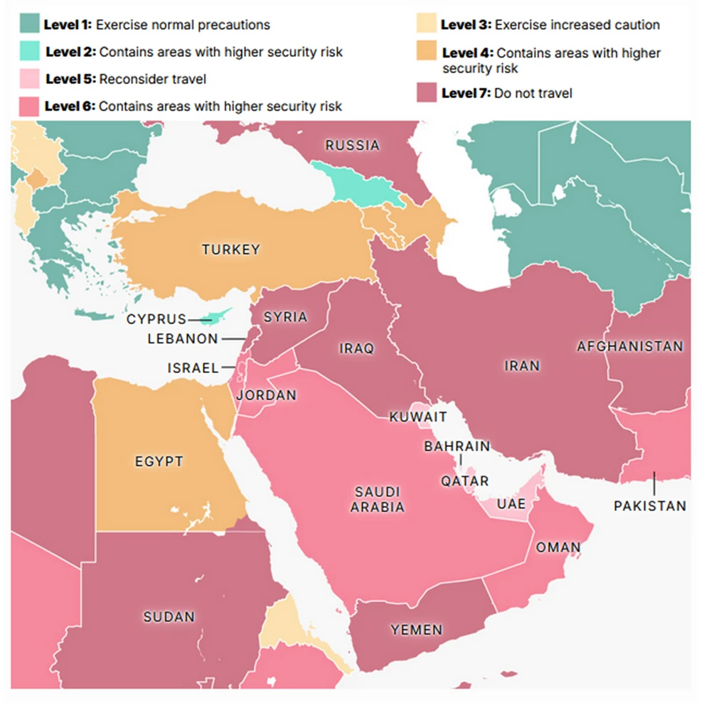 Οι Ηνωμένες Πολιτείες χρησιμοποιούν σύστημα αξιολόγησης κινδύνου με επίπεδα απειλής από το Level 1 (άσκηση κανονικής προσοχής) έως το Level 7 (μην ταξιδεύετε). Με την κλιμάκωση της σύγκρουσης, αρκετές χώρες της Μέσης Ανατολής κατατάσσονται πλέον στις υψηλότερες κατηγορίες κινδύνου. Ο συγκεκριμένος χάρτης έχει την Ελλάδα στην κατηγορία 1, αυτής δηλαδή του χαμηλότερου κινδύνου.