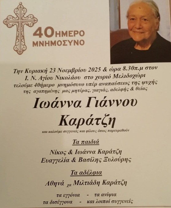 Το 40ήμερο μνημόσυνο της εκλιπούσας για την ανάπαυση της ψυχής της θα τελεστεί την Κυριακή 23 Νοεμβρίου 2025 στις 8:30 πμ στον Ιερό Ναό Αγίου Νικολάου στο χωριό Μελιδοχώρι.
