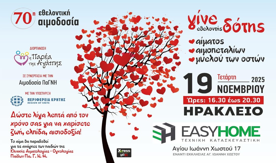 Η “Παρέα της Αγάπης”, σε συνεργασία με την Αιμοδοσία του Πανεπιστημιακού Γενικού Νοσοκομείου Ηρακλείου (ΠαΓΝΗ) και με την υποστήριξη της Περιφέρειας Κρήτης, διοργανώνει την 70ή εθελοντική αιμοδοσία, αφιερωμένη στα παιδιά της Κλινικής Αιματολογίας – Ογκολογίας Παίδων ΠαΓΝΗ.
