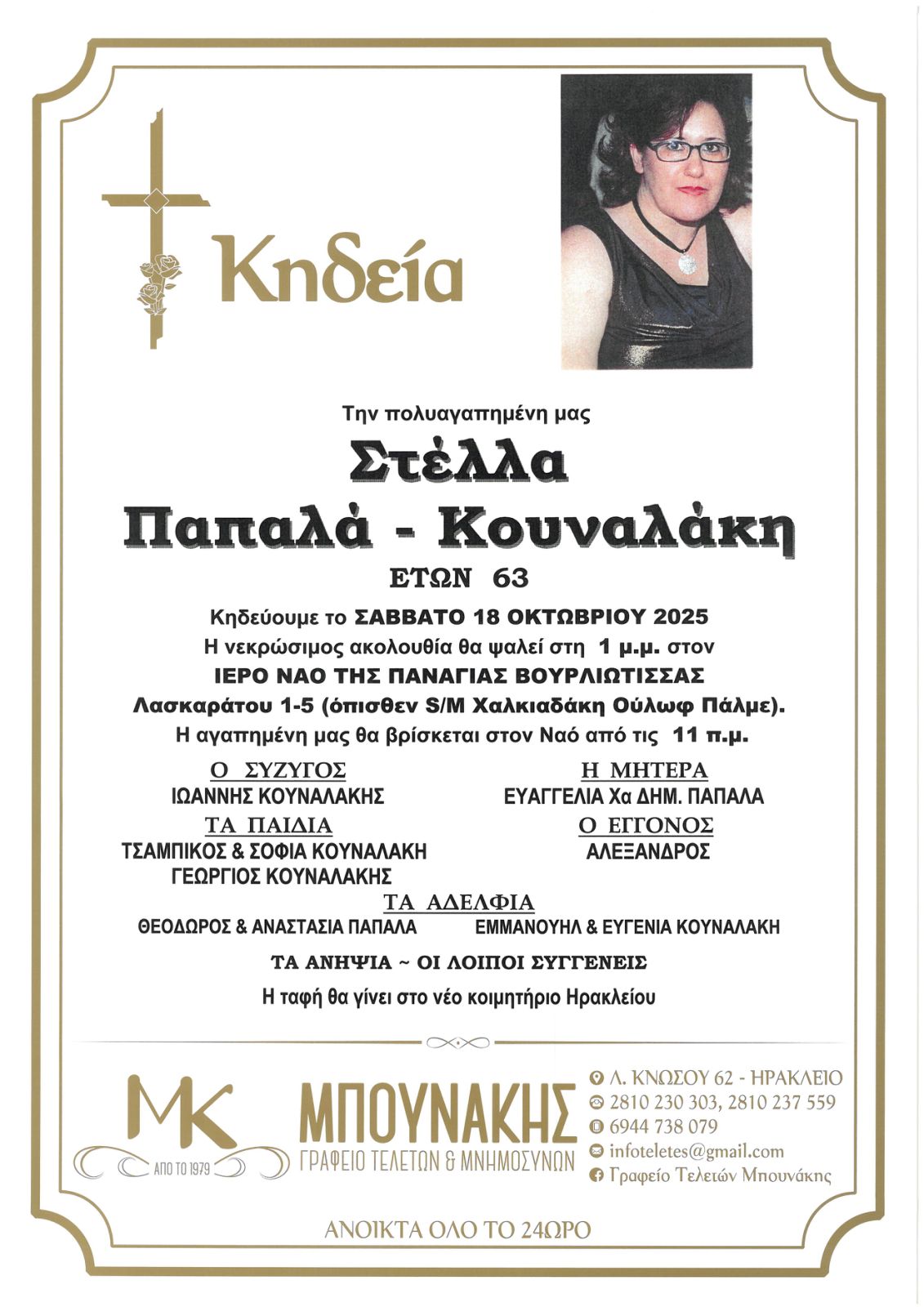 Θλίψη σκόρπισε στην τοπική κοινωνία του Ηρακλείου η είδηση του θανάτου της Στέλλας Παπαλά – Κουναλάκη, σε ηλικία 63 ετών.