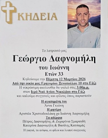 - Η κηδεία του Γιώργου θα πραγματοποιηθεί αύριο Τετάρτη 12 Μαρτίου 2026.
