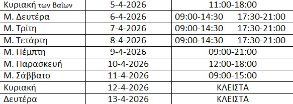 Ο Εμπορικός Σύλλογος Ηρακλείου ενημερώνει τα μέλη του για το Πασχαλινό ωράριο που θα εφαρμοστεί την εορταστική περίοδο του Πάσχα από 5–4-2026 έως 13-4-2026