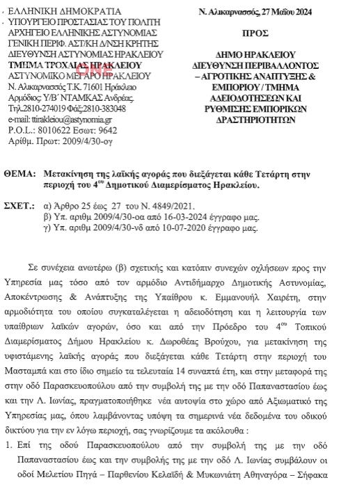- Οι γονείς και οι εκπαιδευτικοί του 10ου Δημοτικού Σχολείου Ηρακλείου ανησυχούν για την ασφάλεια των μαθητών εξαιτίας της λαϊκής αγοράς που λειτουργεί κάθε Τετάρτη κοντά στο σχολείο.