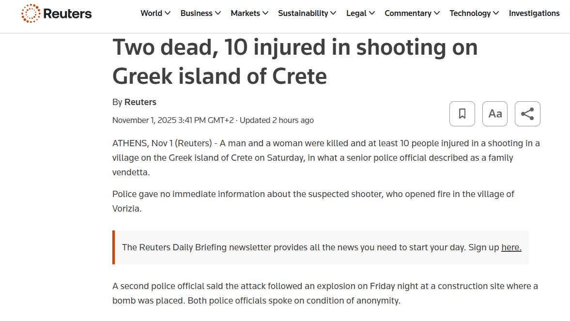 «Γυναίκα, 56 ετών, είναι μία από τους δύο νεκρούς, καθώς οικογενειακή βεντέτα εξελίσσεται σε ανταλλαγή πυροβολισμών με AK-47 και καραμπίνα σε ορεινό χωριό της Κρήτης».