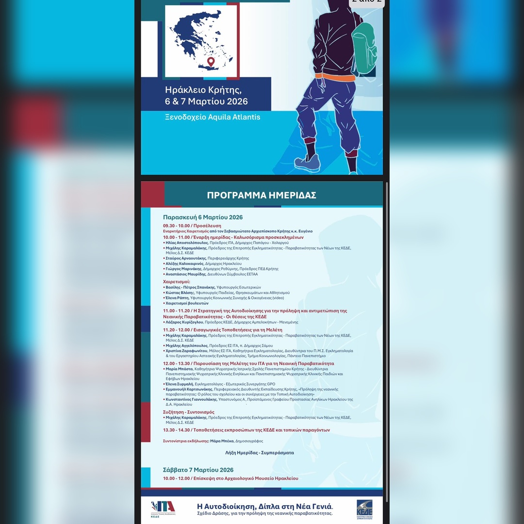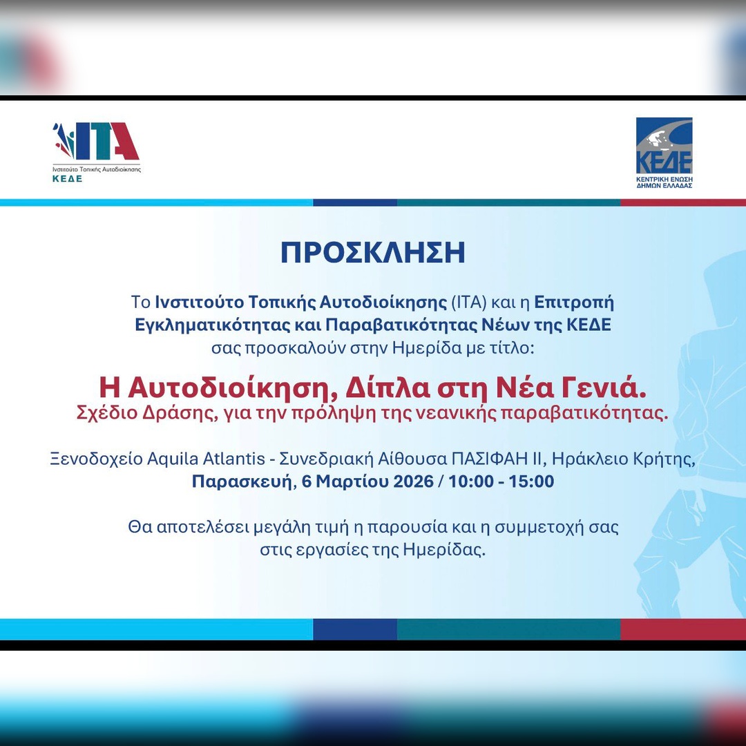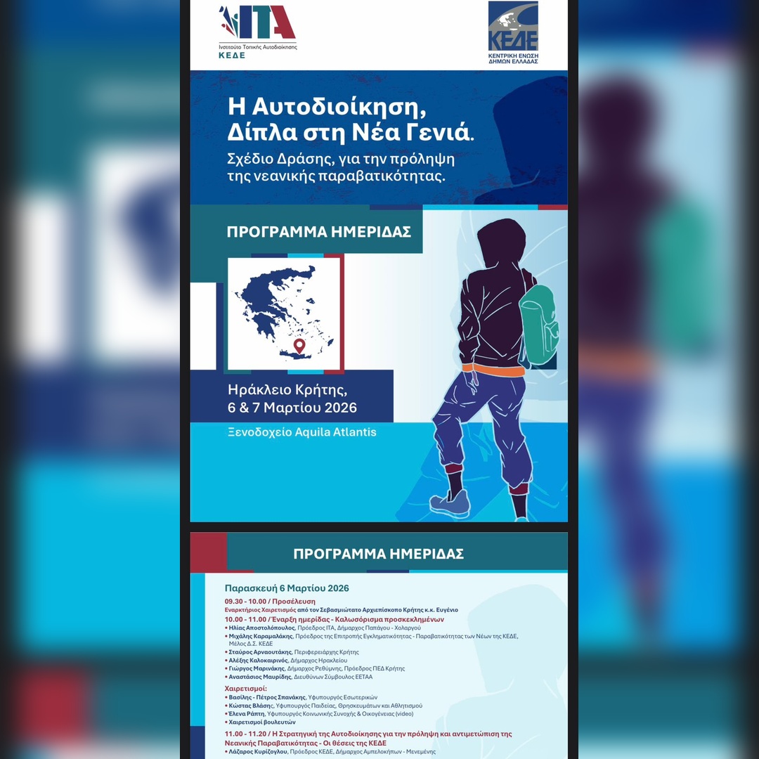 Η ημερίδα διοργανώνεται από την Επιτροπή Εγκληματικότητας, Παραβατικότητας των Νέων της Κ.Ε.Δ.Ε. και το Ινστιτούτο Τοπικής Αυτοδιοίκησης και θα πραγματοποιηθεί την Παρασκευή 6 Μαρτίου 2026, στο Ηράκλειο, στο ξενοδοχείο Aquila Atlantis Hotel (Συνεδριακή Αίθουσα ΠΑΣΙΦΑΗ ΙΙ), από τις 10:00 έως τις 15:00.