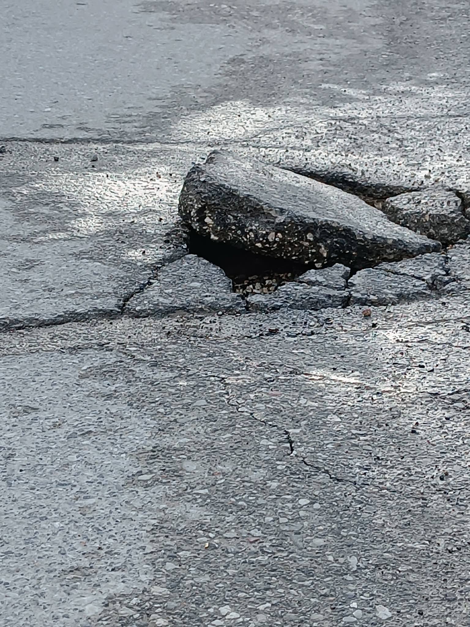 Σύμφωνα με την ίδια, στο κέντρο του δρόμου υπάρχει μεγάλο τμήμα το οποίο έχει αποκολληθεί και προεξέχει, δημιουργώντας σοβαρό κίνδυνο για τους διερχόμενους οδηγούς.