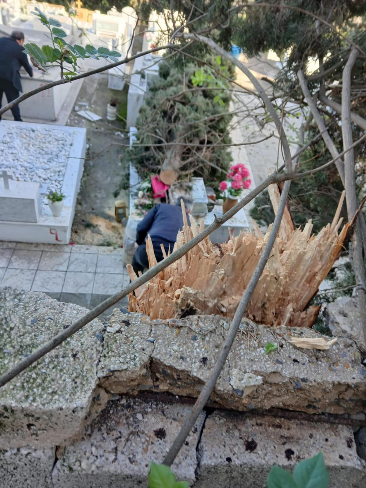 - Ένα κυπαρίσσι έπεσε πάνω σε τάφους στο νεκροταφείο των Βουτών, χωρίς να υπάρξουν τραυματισμοί.