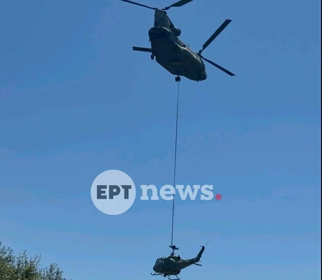 Με τη συνδρομή βαρέως τύπου ελικοπτέρου Chinook πραγματοποιήθηκε το μεσημέρι της Τρίτης η απομάκρυνση και μεταφορά του Augusta Bell από τον ελαιώνα κοντά στο χωριό Αμαριανό, όπου χθες είχε πραγματοποιήσει αναγκαστική προσγείωση λόγω βλάβης.