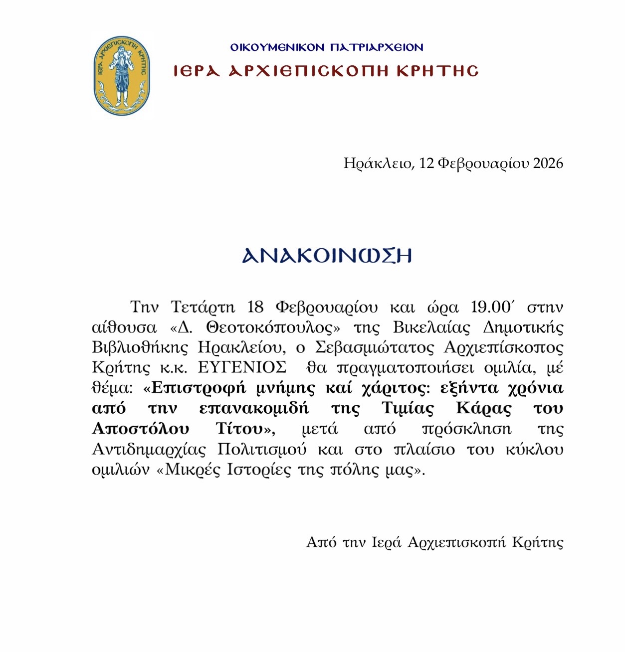 «Επιστροφή μνήμης και χάριτος: 60 χρόνια από την επανακομιδή της Τιμίας Κάρας του Αποστόλου Τίτου» είναι ο τίτλος της ομιλίας του Σεβασμιώτατου Αρχιεπίσκοπου Κρήτης κ.κ. Ευγένιου που θα πραγματοποιηθεί στο πλαίσιο του τρίτου κύκλου των «Μικρών Ιστοριών της Πόλης» της Αντιδημαρχίας Πολιτισμού του Δήμου Ηρακλείου και της Βικελαίας Δημοτικής Βιβλιοθήκης την Τετάρτη 18 Φεβρουαρίου στις 19:00 στην αίθουσα «Δομήνικος Θεοτοκόπουλος» της Β.Δ.Β..