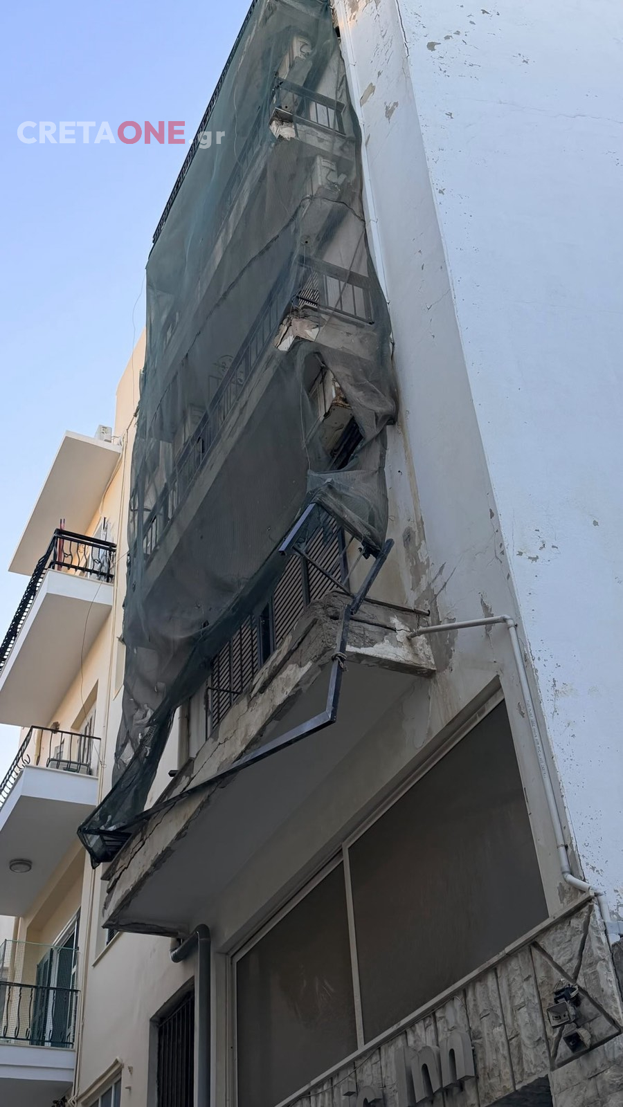 Σοβαρή εικόνα εγκατάλειψης παρουσιάζει κτίριο στο κέντρο του Ηρακλείου, με μπαλκόνια να έχουν καταρρεύσει μερικώς και κομμάτια μπετόν να είναι έτοιμα να πέσουν στον δρόμο.