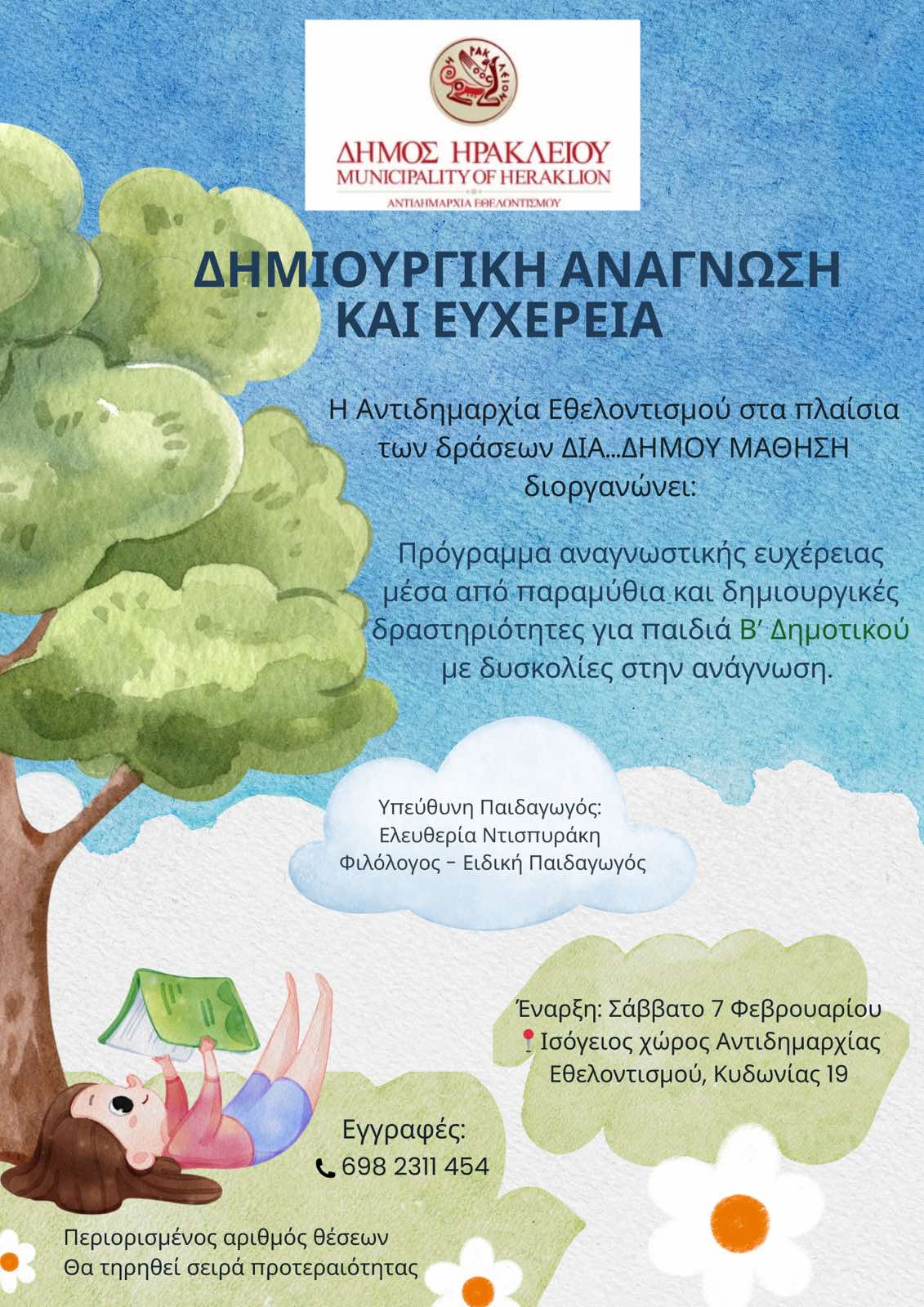 Με το νέο πρόγραμμα δημιουργικής ανάγνωσης & ευχέρειας με δωρεάν συμμετοχή εμπλουτίζεται το πρόγραμμα «Διά…Δήμου Μάθηση» που εγκαινίασε ο Δήμος Ηρακλείου και η Αντιδημαρχία Εθελοντισμού τον Ιανουάριο του 2025 με στόχο τα διανοητικά, γνωστικά, κοινωνικά και πνευματικά οφέλη της δια βίου μάθησης.