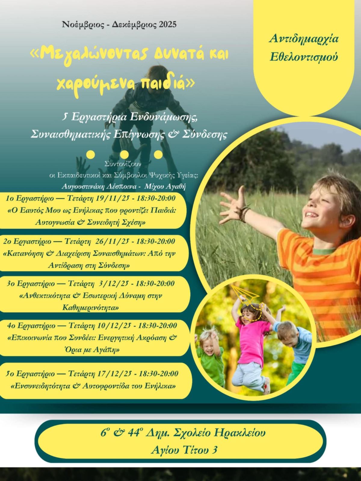 Με το νέο σεμινάριο «Μεγαλώνοντας Δυνατά και Χαρούμενα Παιδιά» με δωρεάν συμμετοχή εμπλουτίζεται το πρόγραμμα «Διά…Δήμου Μάθηση» που εγκαινίασε ο Δήμος Ηρακλείου και η Αντιδημαρχία Εθελοντισμού τον Ιανουάριο του 2025 με στόχο τα διανοητικά, γνωστικά, κοινωνικά και πνευματικά οφέλη της δια βίου μάθησης.
