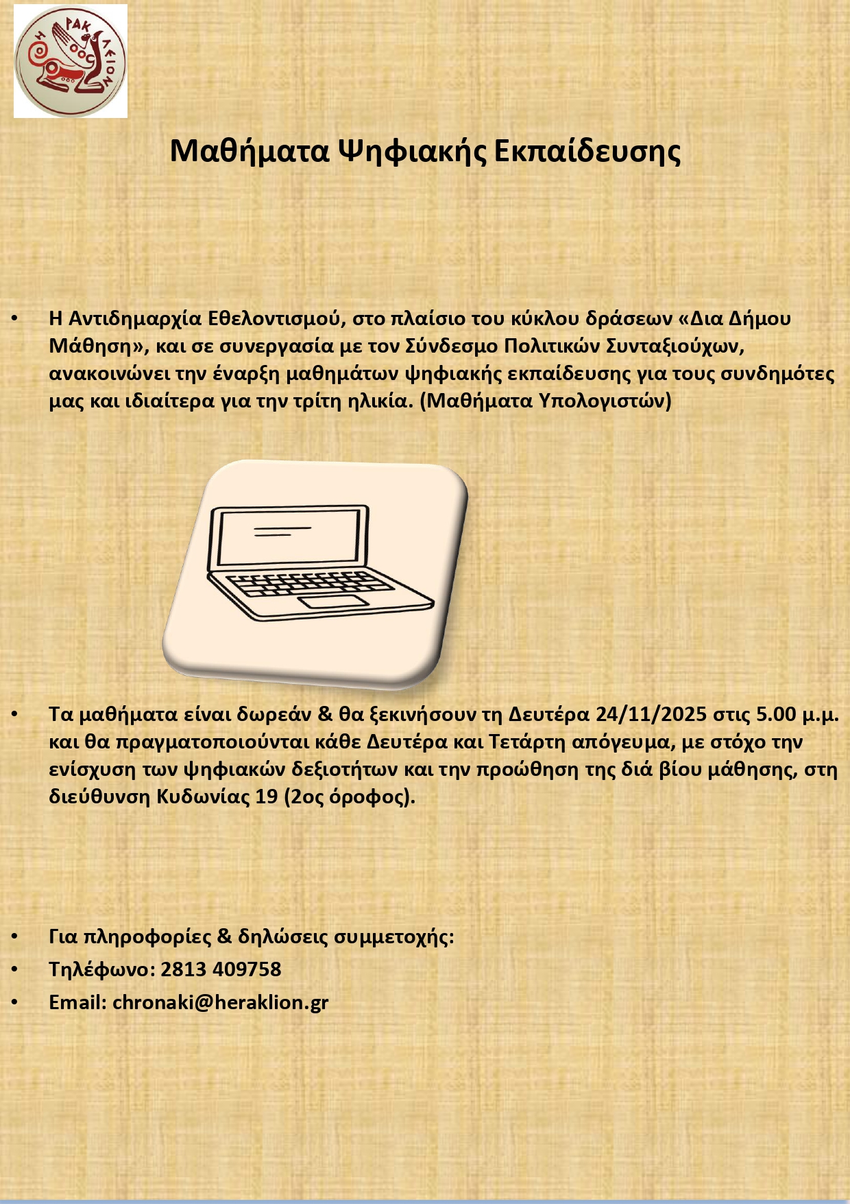 Το νέο σεμινάριο, που πραγματοποιείται σε συνεργασία με τον Σύνδεσμο Πολιτικών Συνταξιούχων Νομού Ηρακλείου, απευθύνεται σε όλους καθώς και σε συνανθρώπους μας της Τρίτης Ηλικίας που επιθυμούν να εξοικειωθούν με τη χρήση των ηλεκτρονικών υπολογιστών και με την πρόσβαση στη σύγχρονη ψηφιακή γνώση.