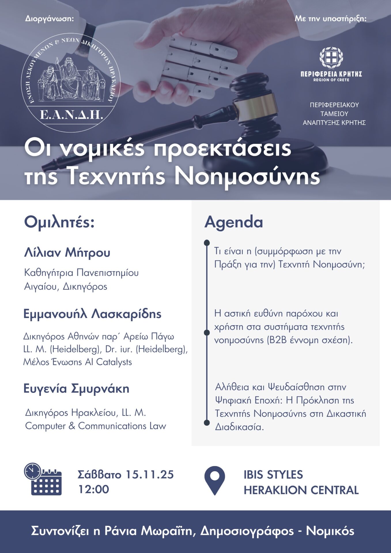 Η Ένωση Ασκουμένων και Νέων Δικηγόρων Ηρακλείου (Ε.Α.Ν.Δ.Η.) διοργανώνει με την υποστήριξη της Περιφέρειας Κρήτης επιστημονική ημερίδα με θέμα «Οι νομικές προεκτάσεις της τεχνητής νοημοσύνης» το Σάββατο 15 Νοεμβρίου 2025.