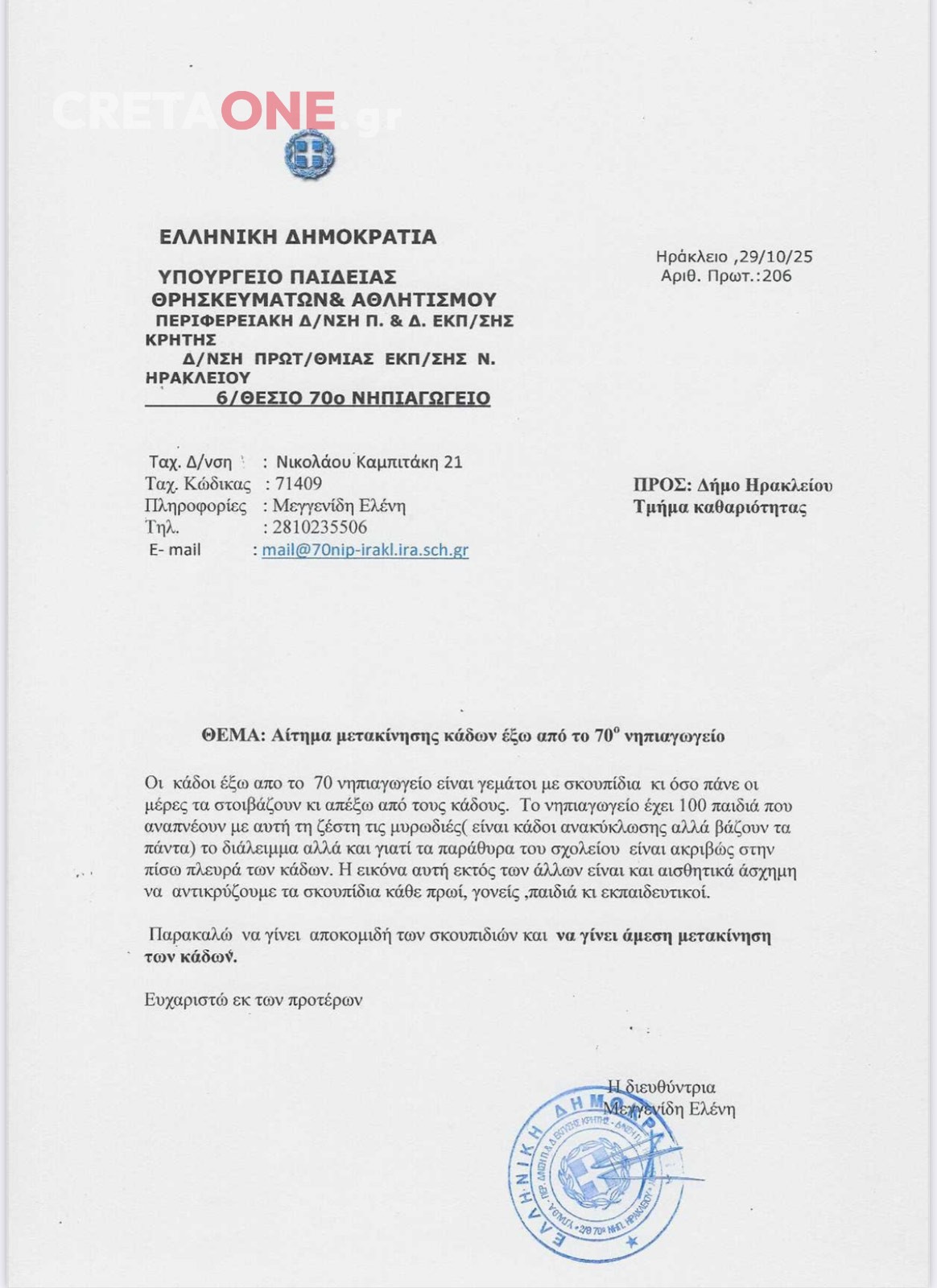 «Η εικόνα αυτή είναι αισθητικά άσχημη και επικίνδυνη για την υγεία των παιδιών», σημειώνει στο έγγραφο προς τον Δήμο Ηρακλείου η διευθύντρια του σχολείου, Ελένη Μεγγελίδη, προειδοποιώντας ότι 100 παιδιά ζουν καθημερινά μέσα σε αυτές τις συνθήκες.