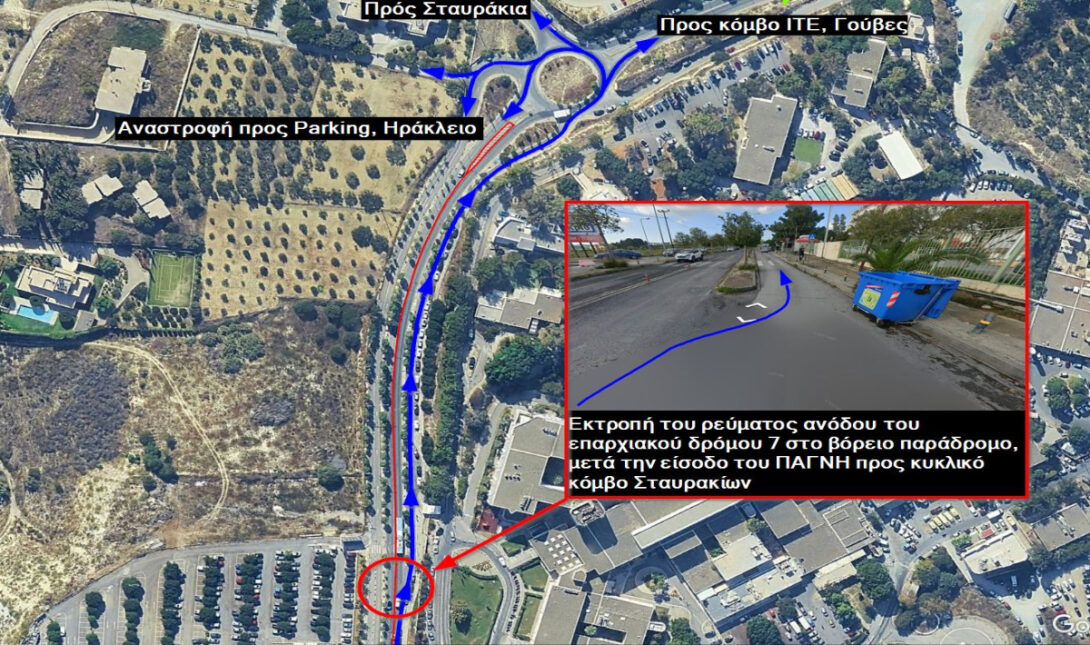 Για την ασφαλή και αποτελεσματική εργασία των συνεργείων θα γίνει εκτροπή του ρεύματος ανόδου του επαρχιακού δρόμου προς το βόρειο παράδρομο, μετά την είσοδο του ΠΑΓΝΗ και έως τον κόμβο Σταυρακίων, όπως φαίνεται στο συνημμένο σκαρίφημα
