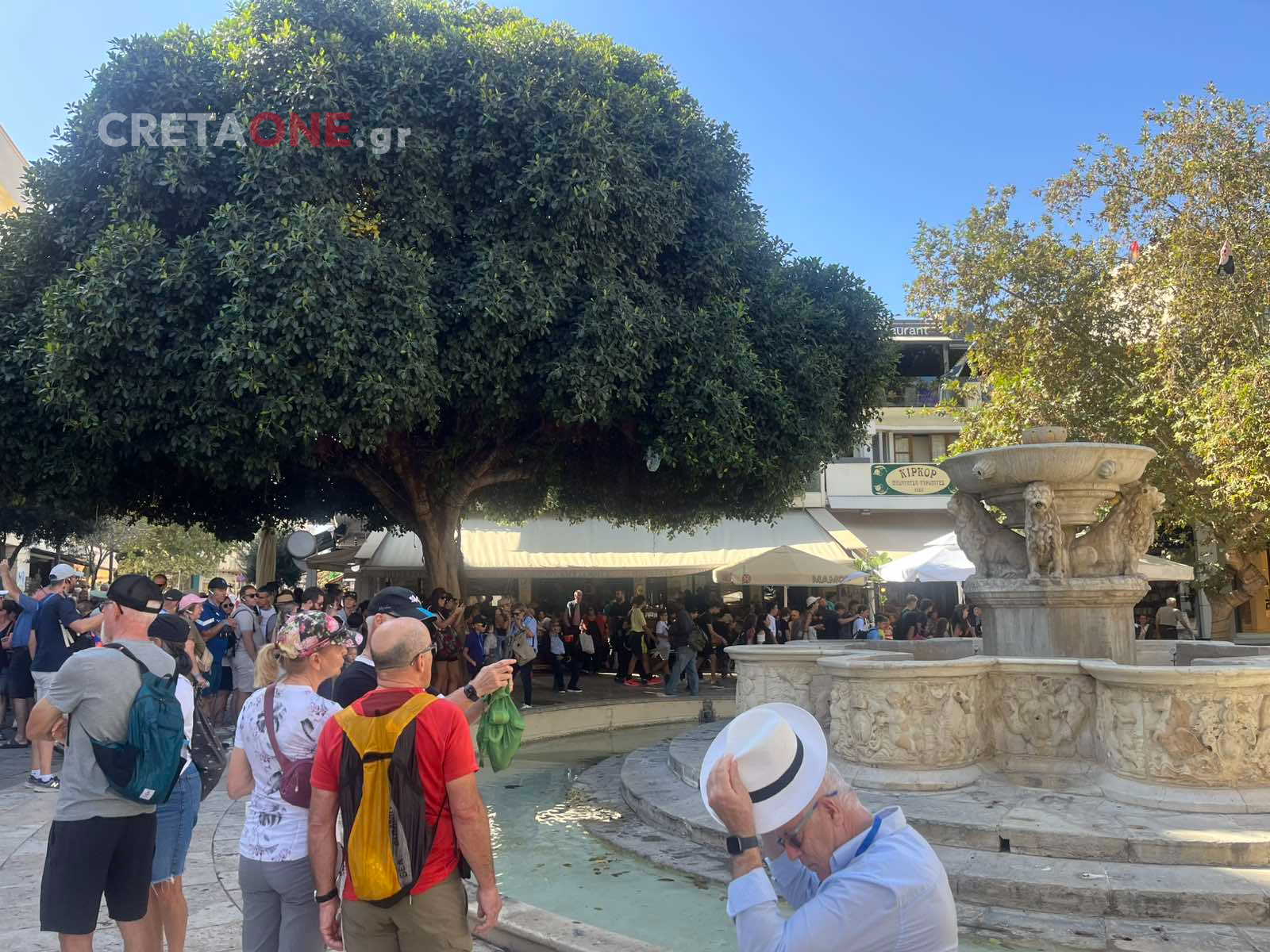 Η πλατεία Λιονταριών —το πιο αναγνωρίσιμο σημείο της πόλης— γέμισε σήμερα από τουρίστες κάθε ηλικίας, που απολαμβάνουν τις τελευταίες ζεστές ημέρες του φθινοπώρου κάτω από τον κρητικό ήλιο.