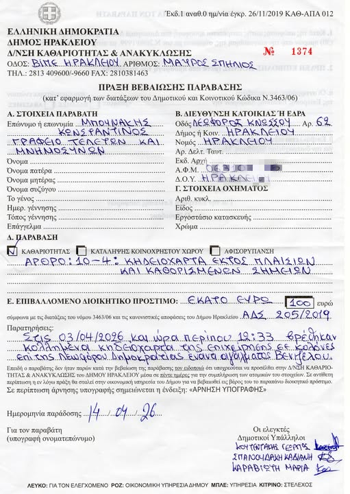 Σύμφωνα με την ανακοίνωση που έκανε ιδιοκτήτης γραφείου τελετών στα social media, ο Δήμος Ηρακλείου έχει προχωρήσει σε επιβολή προστίμων σε όσους τοποθετούν τα κηδειόσημα στους στύλους της ΔΕΗ, ωστόσο όπως υποστηρίζουν οι ίδιοι υπήρξε μια συμφωνία με τον πρώην Αντιδήμαρχο Καθαριότητας Νίκο Γιαλιτάκη ότι θα μπουν πλαίσια και δεν θα πέφτουν πρόστιμα.