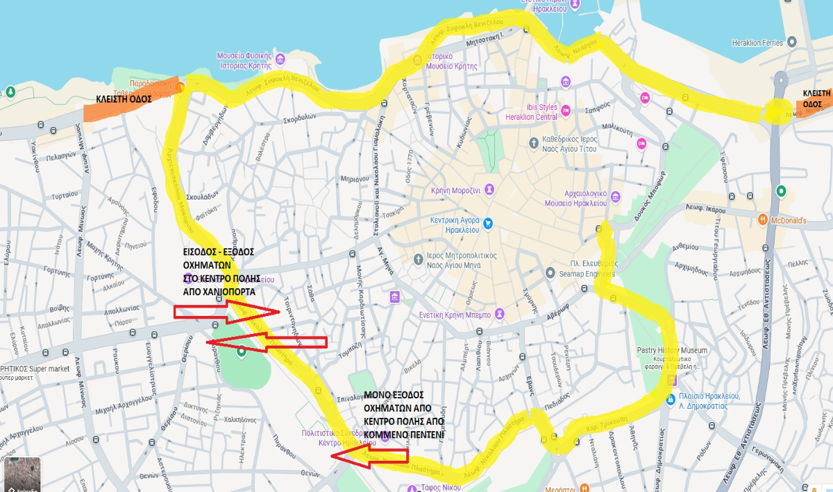 • Το κέντρο της πόλης του Ηρακλείου, εντός των τειχών, κατά τις ώρες 07:30 έως 14:00 θα παραμείνει κλειστό.