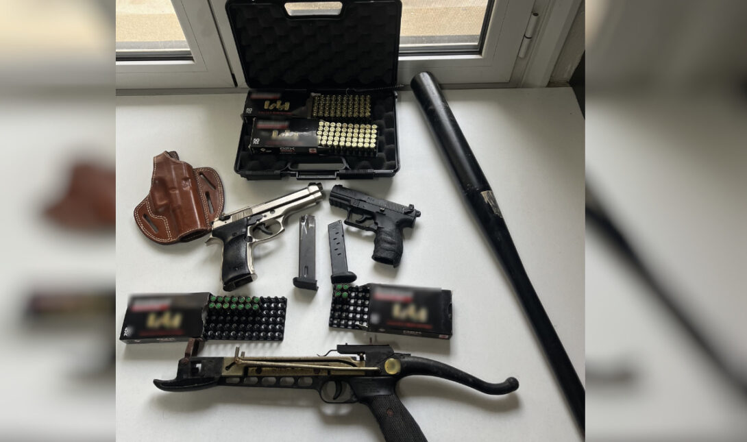 - Κατασχέθηκαν πιστόλια, γεμιστήρες, φυσίγγια, κάλυκες, βαλλίστρα και μεταλλικό ρόπαλο κατά τις έρευνες.