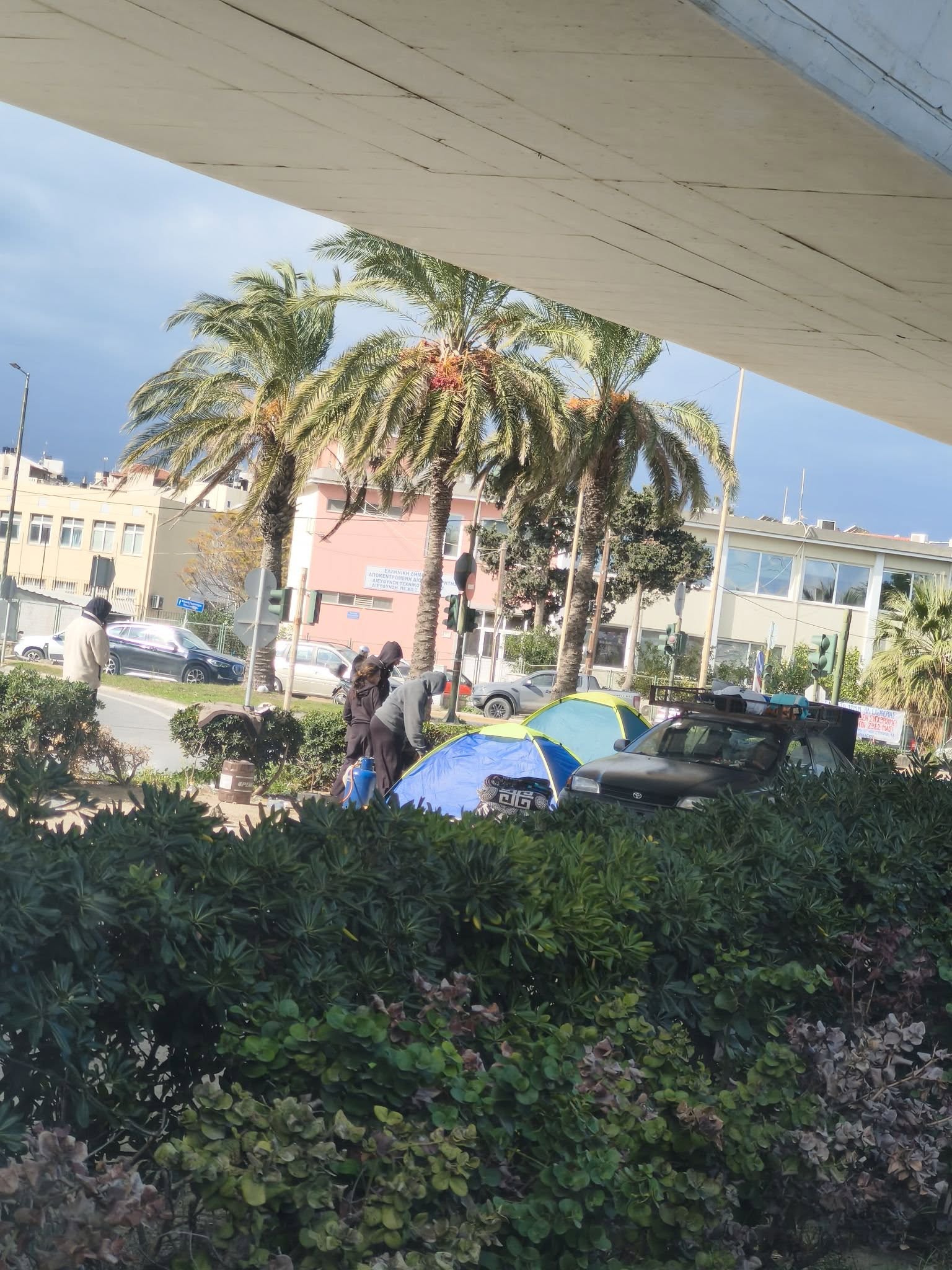 - Οι σκηνές τοποθετήθηκαν κάτω από γέφυρα και δίπλα σε κεντρικό δρόμο, σύμφωνα με φωτογραφίες από το Facebook.
