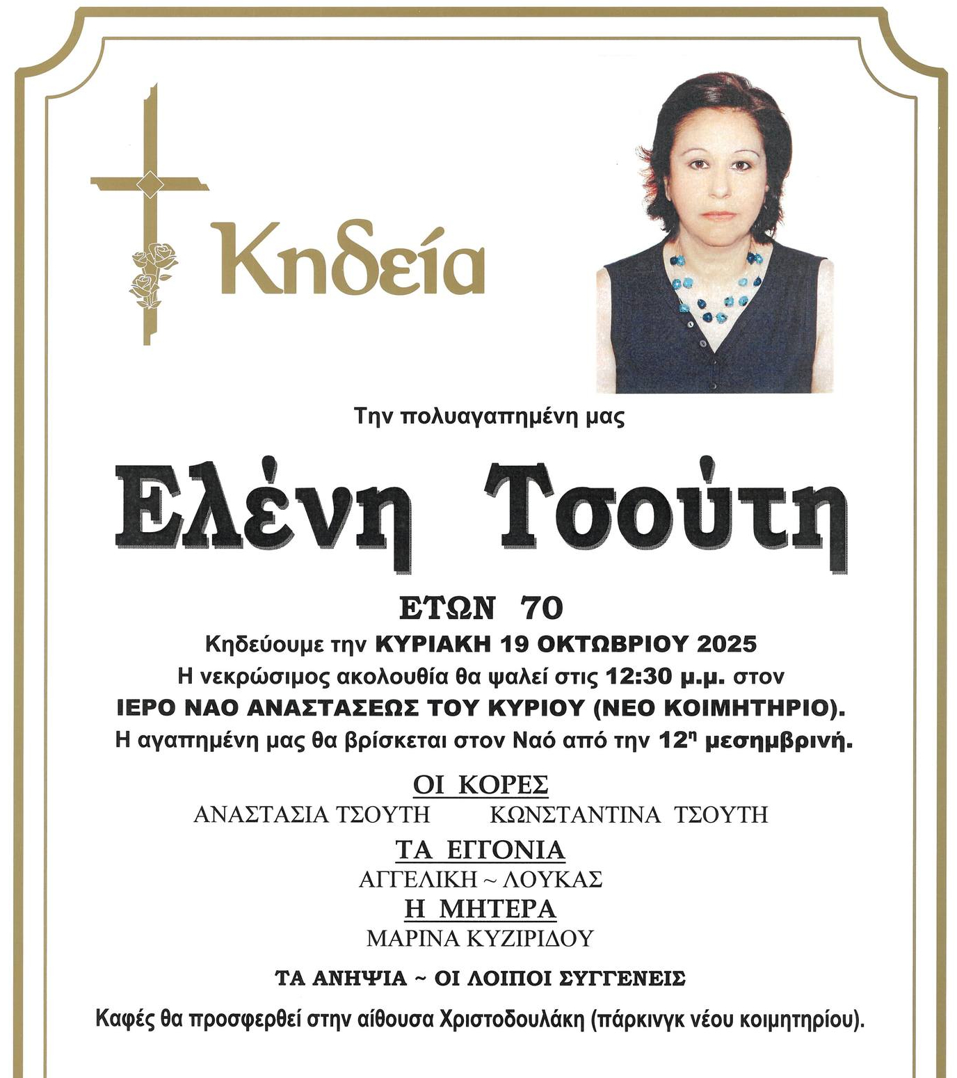 - Η νεκρώσιμη ακολουθία θα γίνει την Κυριακή 19 Οκτωβρίου 2025.