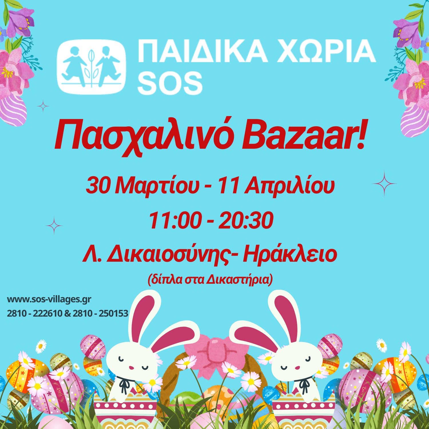 - Το Πασχαλινό Παζάρι των Παιδικών Χωριών SOS στο Ηράκλειο λειτουργεί καθημερινά από τις 11:00 έως τις 20:30 στη Λεωφόρο Δικαιοσύνης.