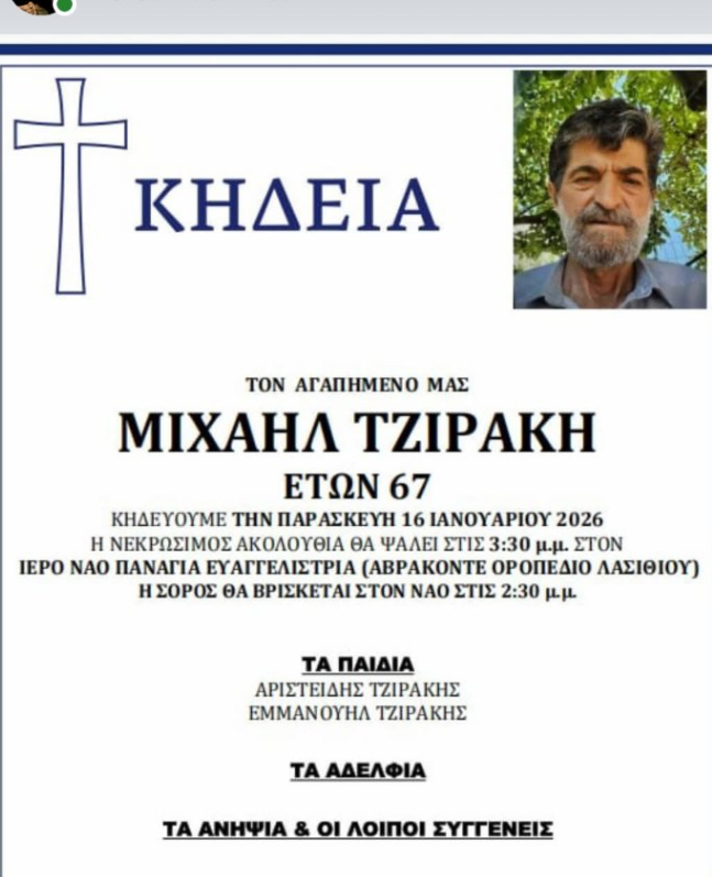 Η νεκρώσιμος ακολουθία θα ψαλεί στον Ιερό Ναό Παναγιά Ευαγγελίστρια στο χωρίο Αβρακόντε.