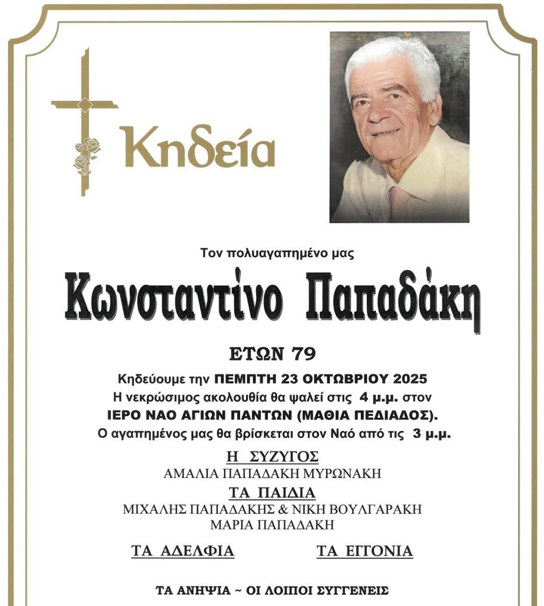 Η κηδεία του πολυαγαπημένου Κωνσταντίνου Παπαδάκη θα τελεστεί την Πέμπτη 23 Οκτωβρίου 2025, στις 4:00 μ.μ., στον Ιερό Ναό Αγίων Πάντων (Μαθιά Πεδιάδος).