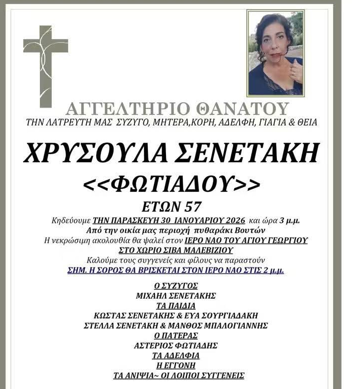 Η νεκρώσιμος ακολουθία θα ψαλεί την Τρίτη 30 Ιανουαρίου στον Ιερό Ναό Αγίου Γεωργίου στο Σίβα του Μαλεβιζίου στις 15:00 μ.μ.
