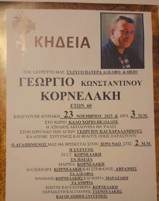 Θλίψη για την τοπική κοινωνία του Ηρακλείου, που θρηνεί τον πρόωρο χαμό του Γεωργίου Κωνσταντίνου Κορνελάκη, ο οποίος έφυγε από τη ζωή σε ηλικία 60 ετών.