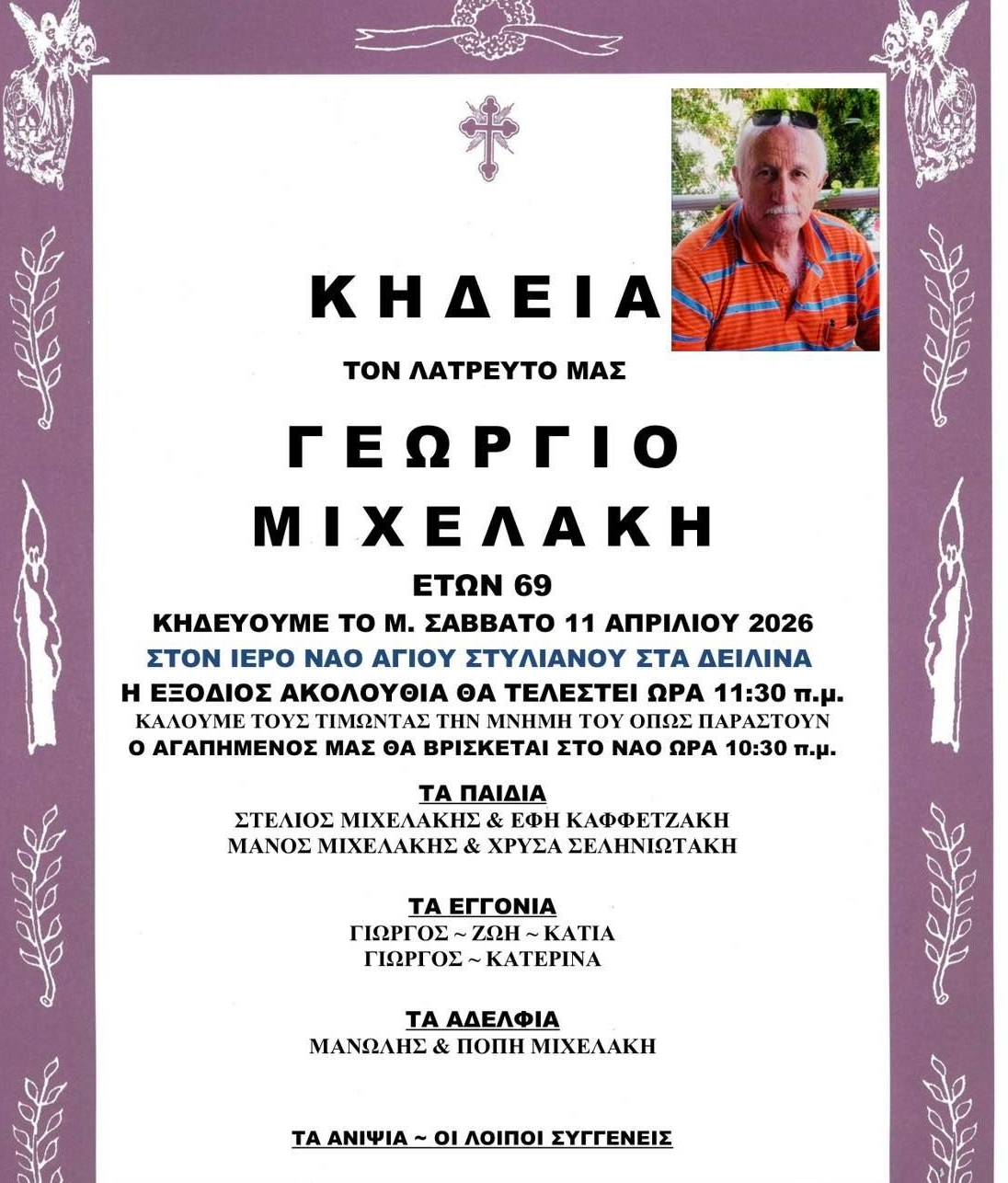 Η νεκρώσιμος ακολουθία θα ψαλεί το Σάββατο 11 Απριλίου στον Ιερό Ναό Αγίου Στυλιανού στα Δειλινά στις 11:οο π.μ