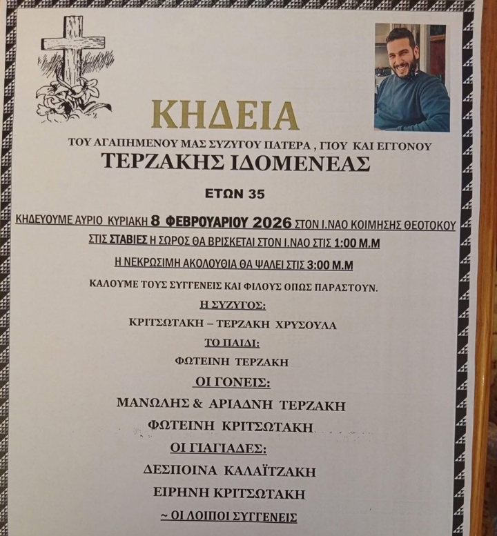 • Ο πρόωρος θάνατος του 35χρονου Ιδομενέα Τερζάκη έχει προκαλέσει θλίψη στην κοινότητα.