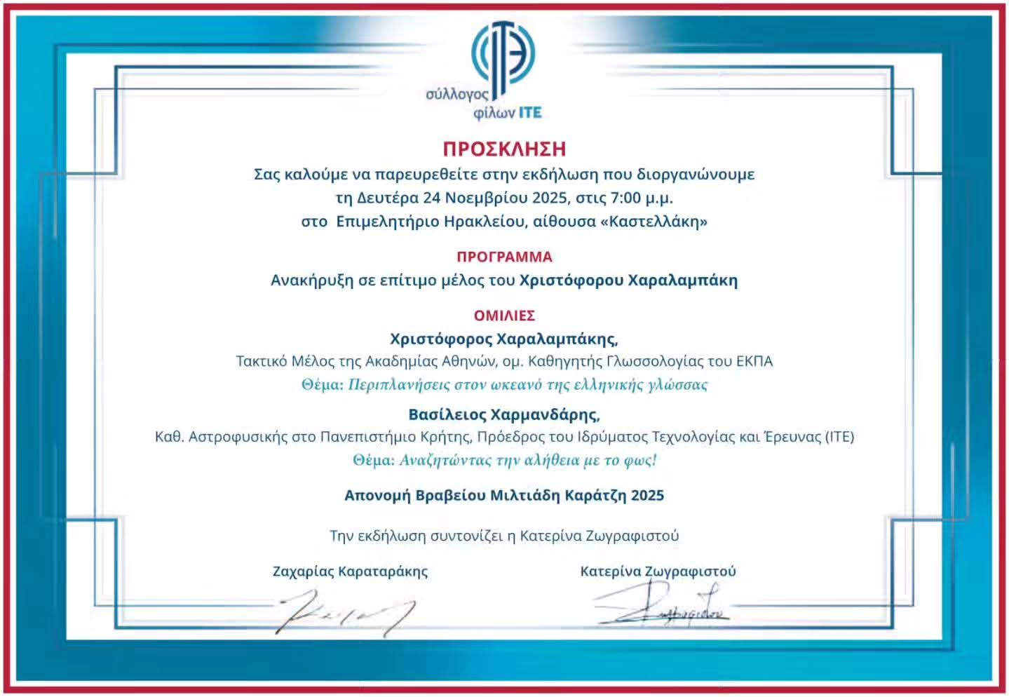Όπως αναφέρει η σχετική ανακοίνωση την εκδήλωση θα προλογίσει ο πρόεδρος του Συλλόγου Ζαχαρίας Καραταράκης. Θα προηγηθεί η ανακήρυξη, σε επίτιμο μέλος του συλλόγου Φίλων του ΙΤΕ, του ακαδημαϊκού και ομότιμου Καθηγητή Γλωσσολογίας του Πανεπιστημίου Αθηνών Χριστόφορου Χαραλαμπάκη.