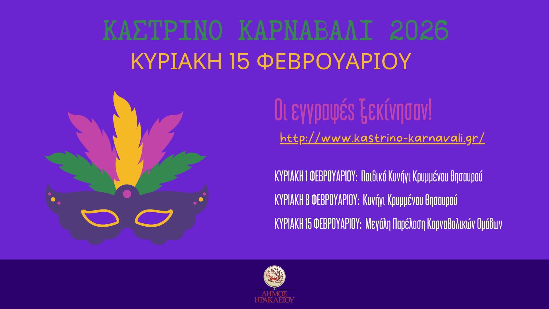- Ο Δήμος Ηρακλείου καλεί όλους να συμμετάσχουν στο Καστρινό Καρναβάλι στις 15 Φεβρουαρίου 2026.