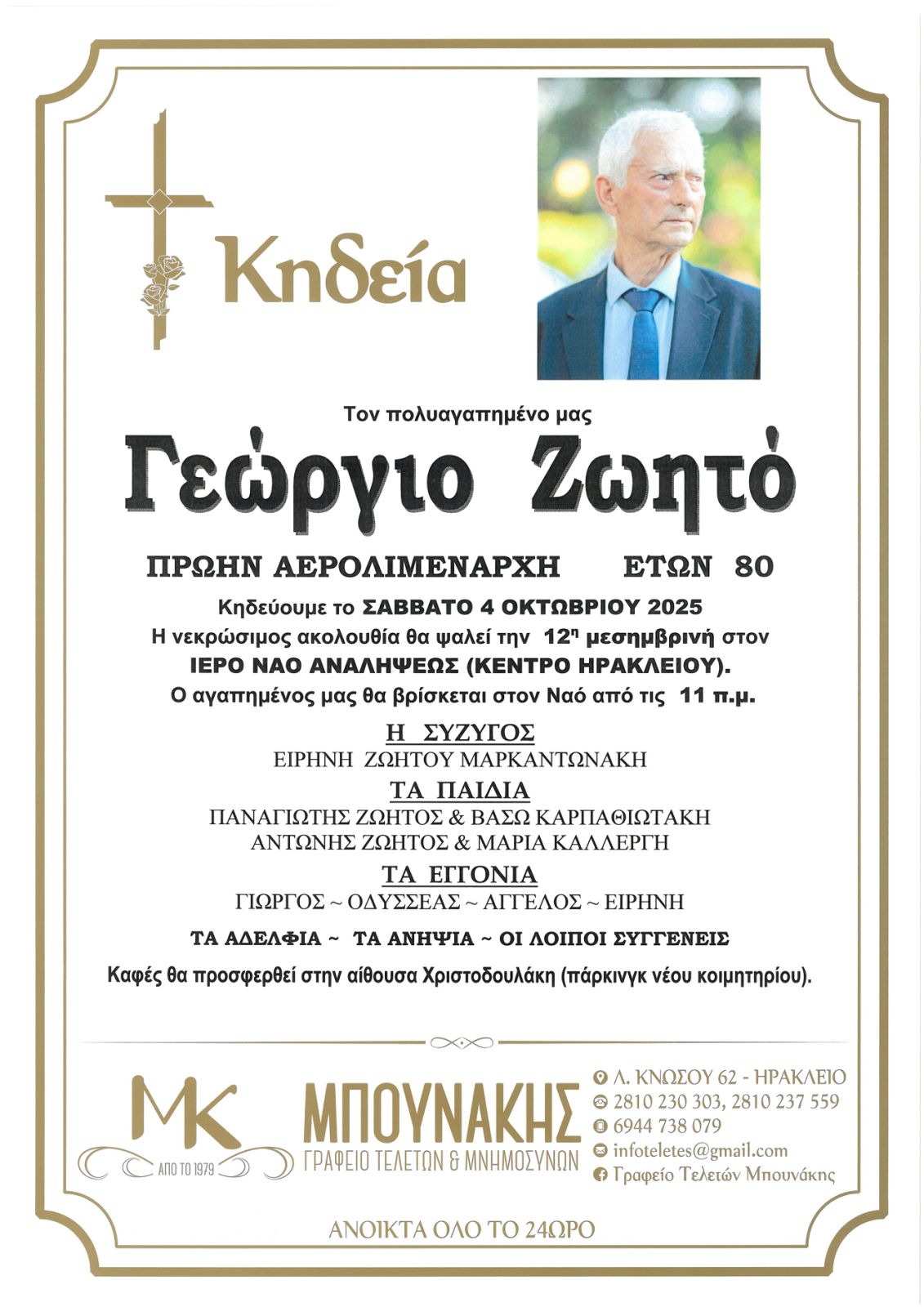 - Η κηδεία θα γίνει το Σάββατο 4 Οκτωβρίου 2025, στις 12:00, στον Ιερό Ναό Αναλήψεως στο Ηράκλειο.